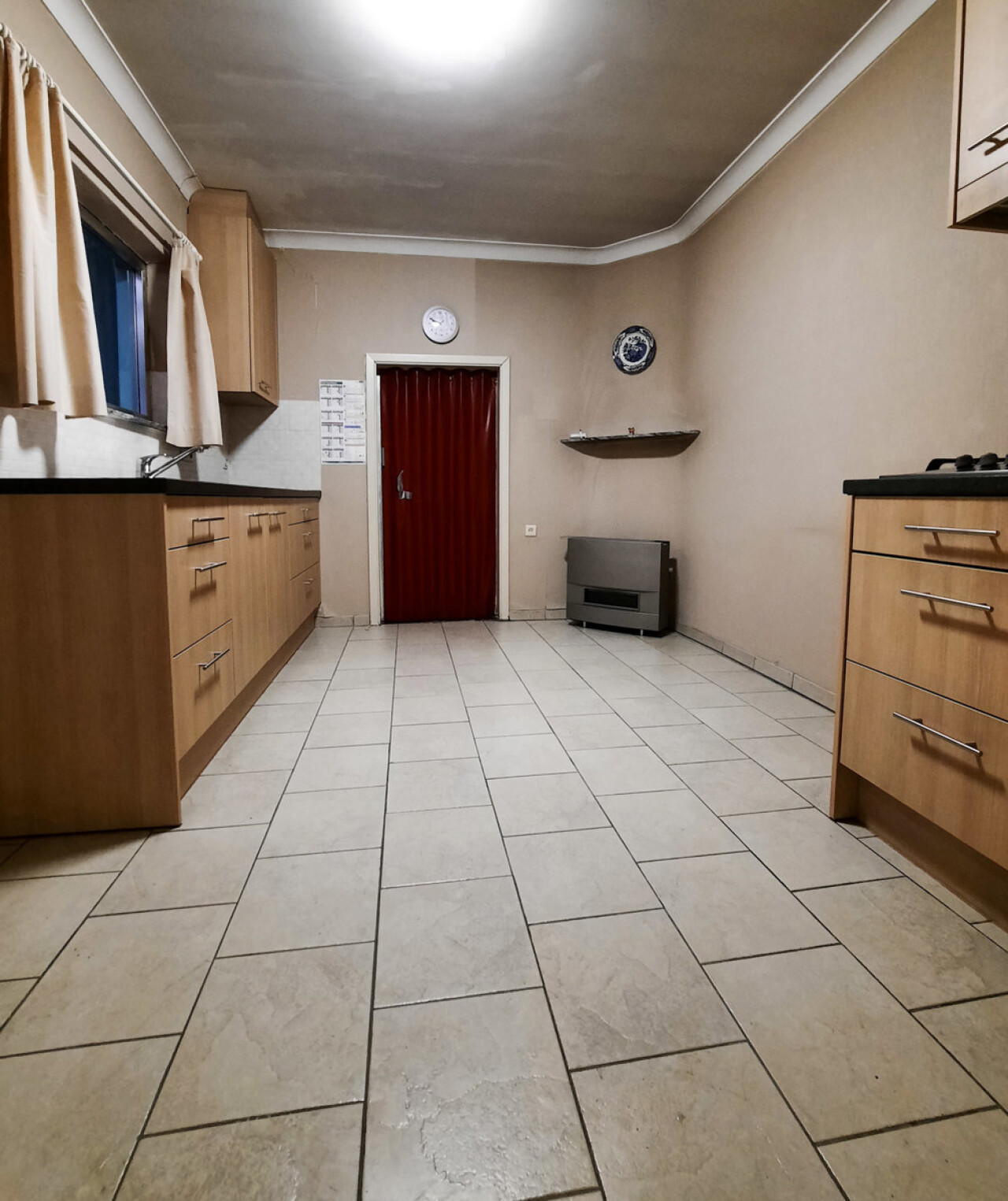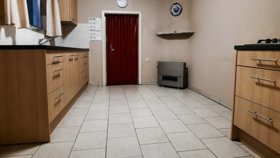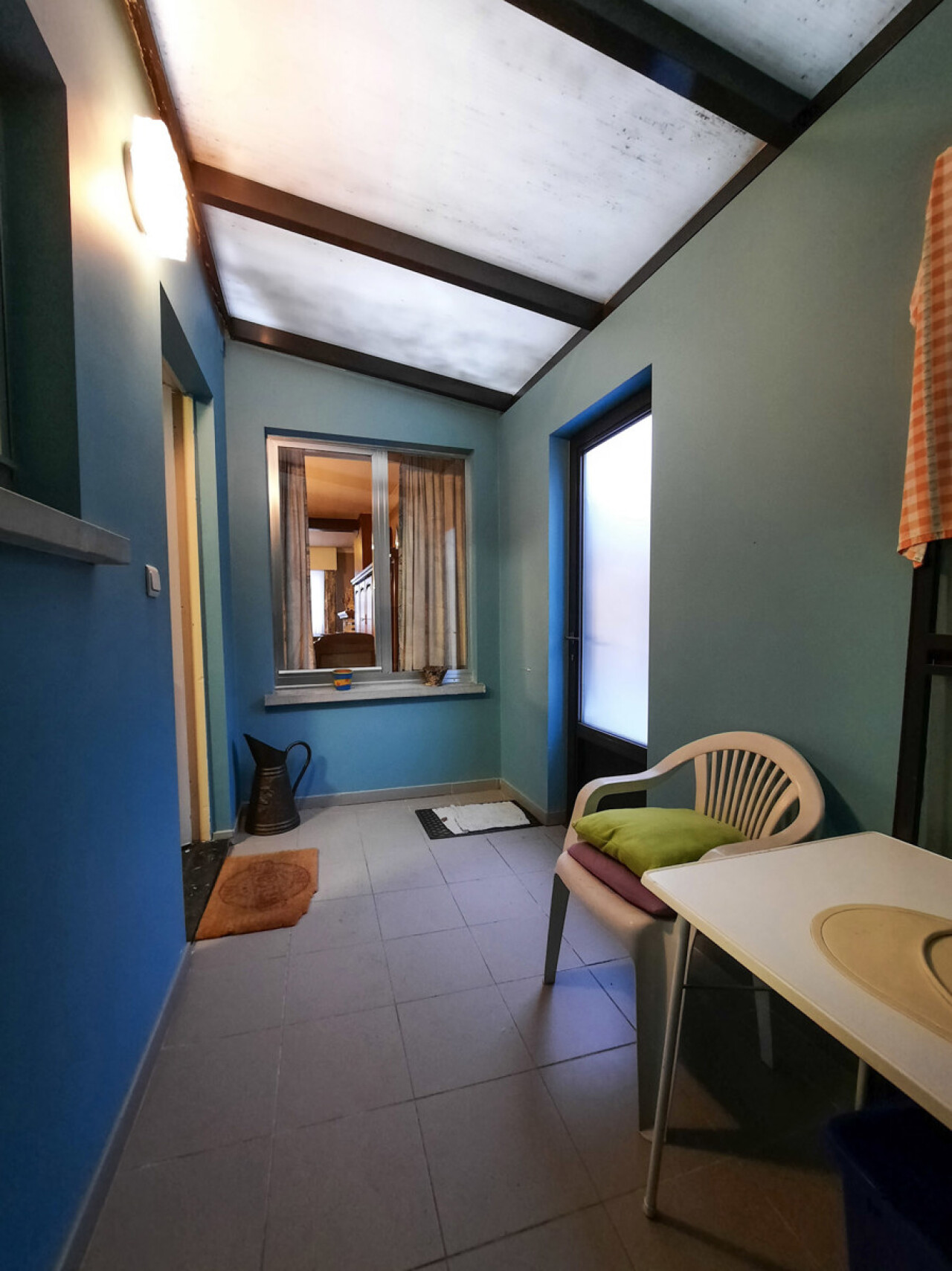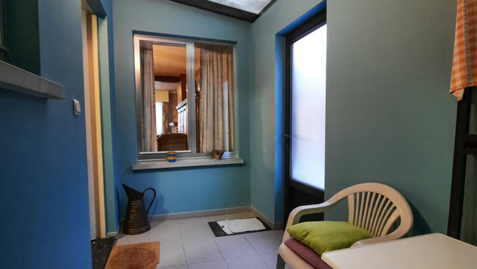 Gelijkvloers: inkomhal, woonkamer, keuken, veranda, bijkeuken, badkamer, extra berging/bergplaats, en nog een buitenberging.